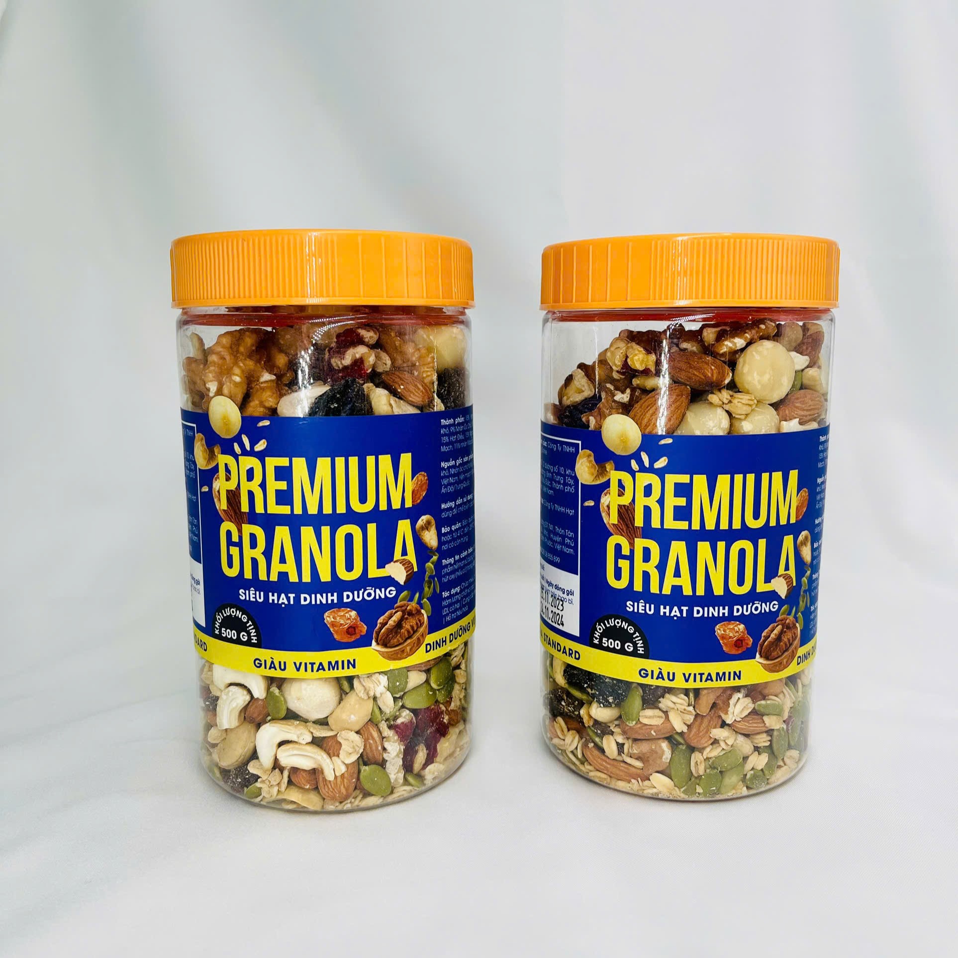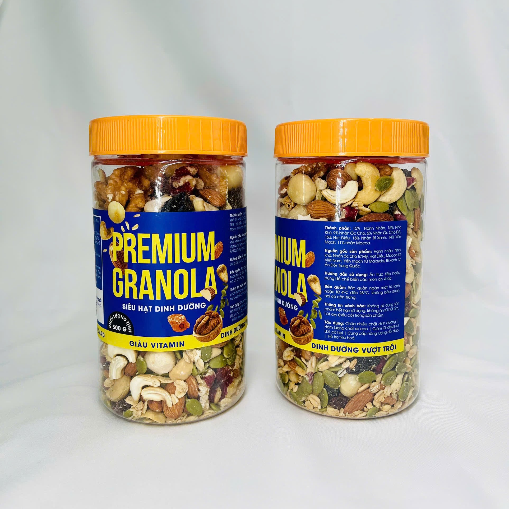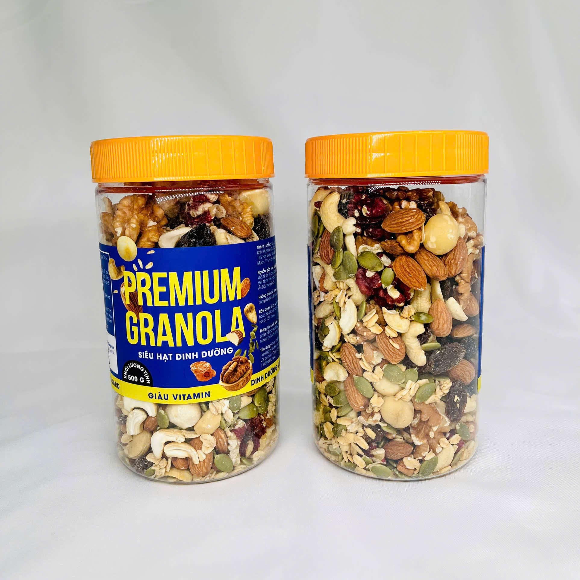 Thành Phần: 15% Hạt điều, 9% Nhân hạt óc chó vàng, 6% Nhân hạt óc chó đỏ, 11% Macca, 15% Hạnh nhân, 15% Bí xanh, 15% Nho khô, 14% Yến Mạch.